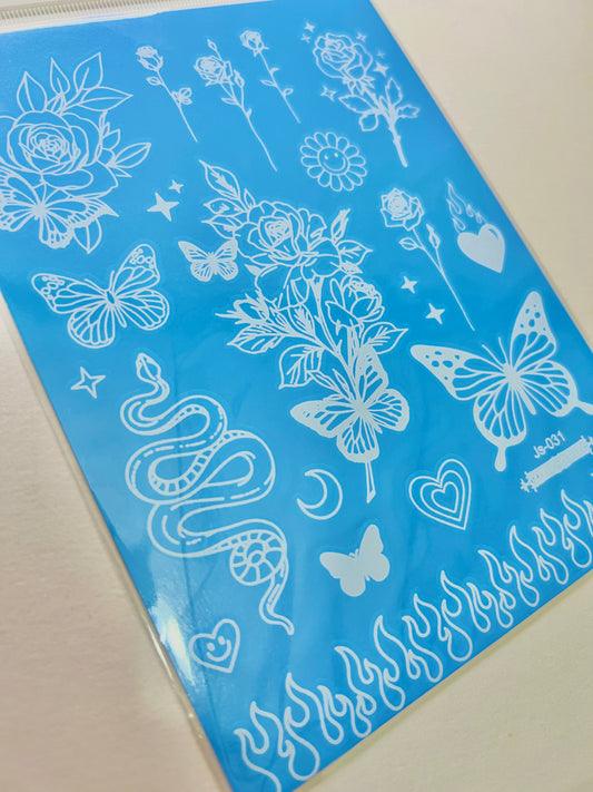 Bendice tu piel con nuestros tatuajes temporales en tinta blanca, ideales para un estilo sutil y elegante. Con diseños que imitan la delicadeza de un tatuaje tradicional, se adhieren a tu piel con agua y duran en tu piel alrededor de 3 días. Puedes removerlos en cualquier momento.