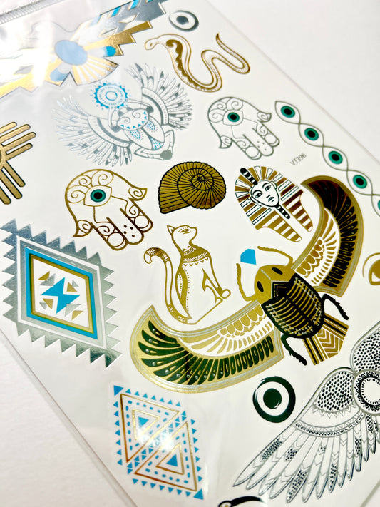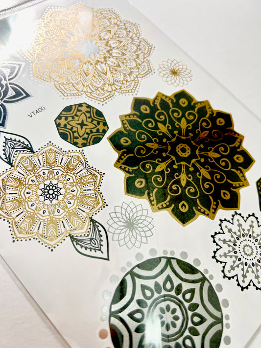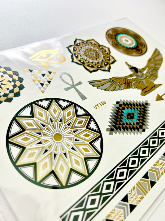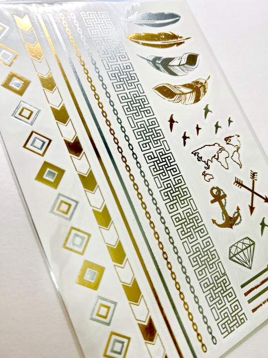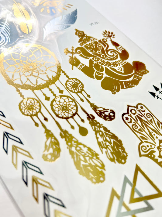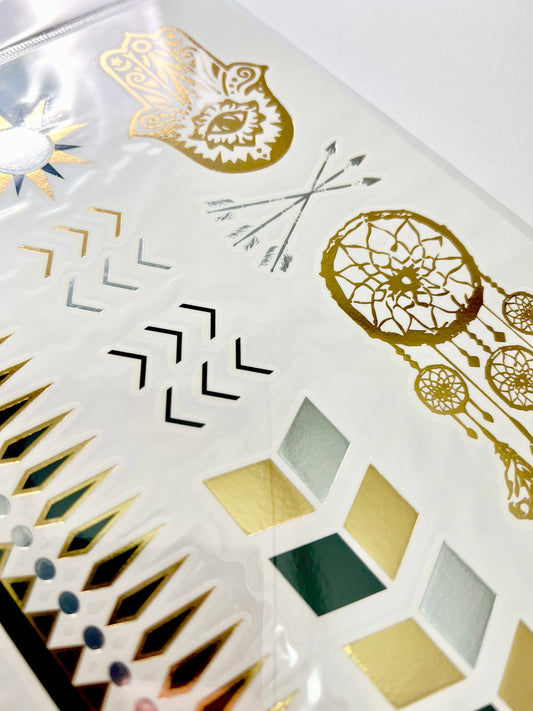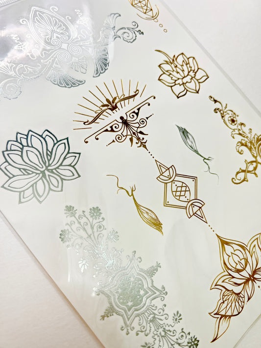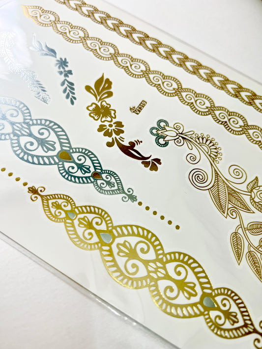 Bendice tu piel con nuestros tatuajes temporales metalizados en tonos dorados y plateados. Estos tatuajes se adhieren con agua y permanecen en tu piel alrededor de 3 días, dándote un brillo único y duradero. Además, puedes removerlos fácilmente en cualquier momento.