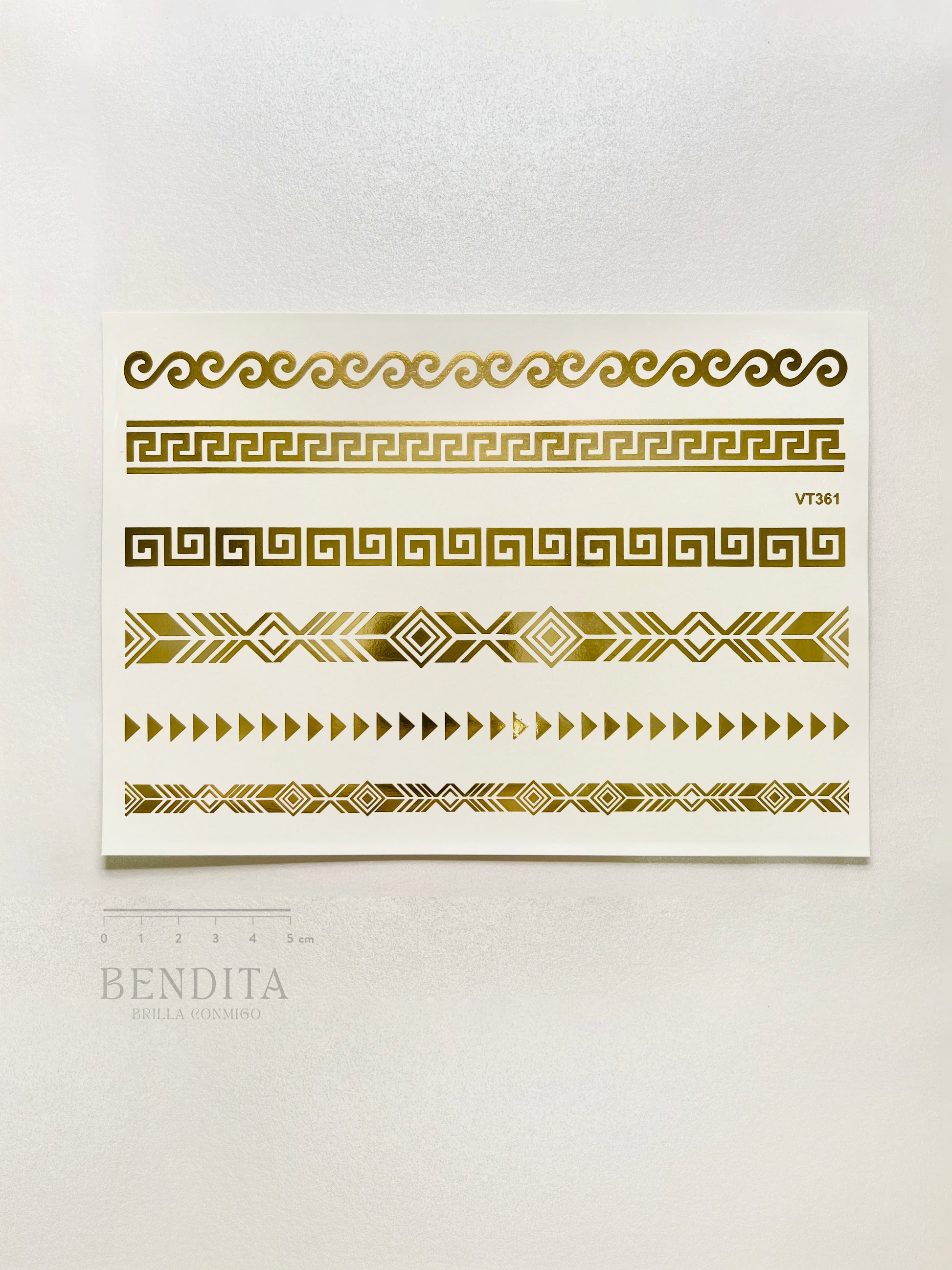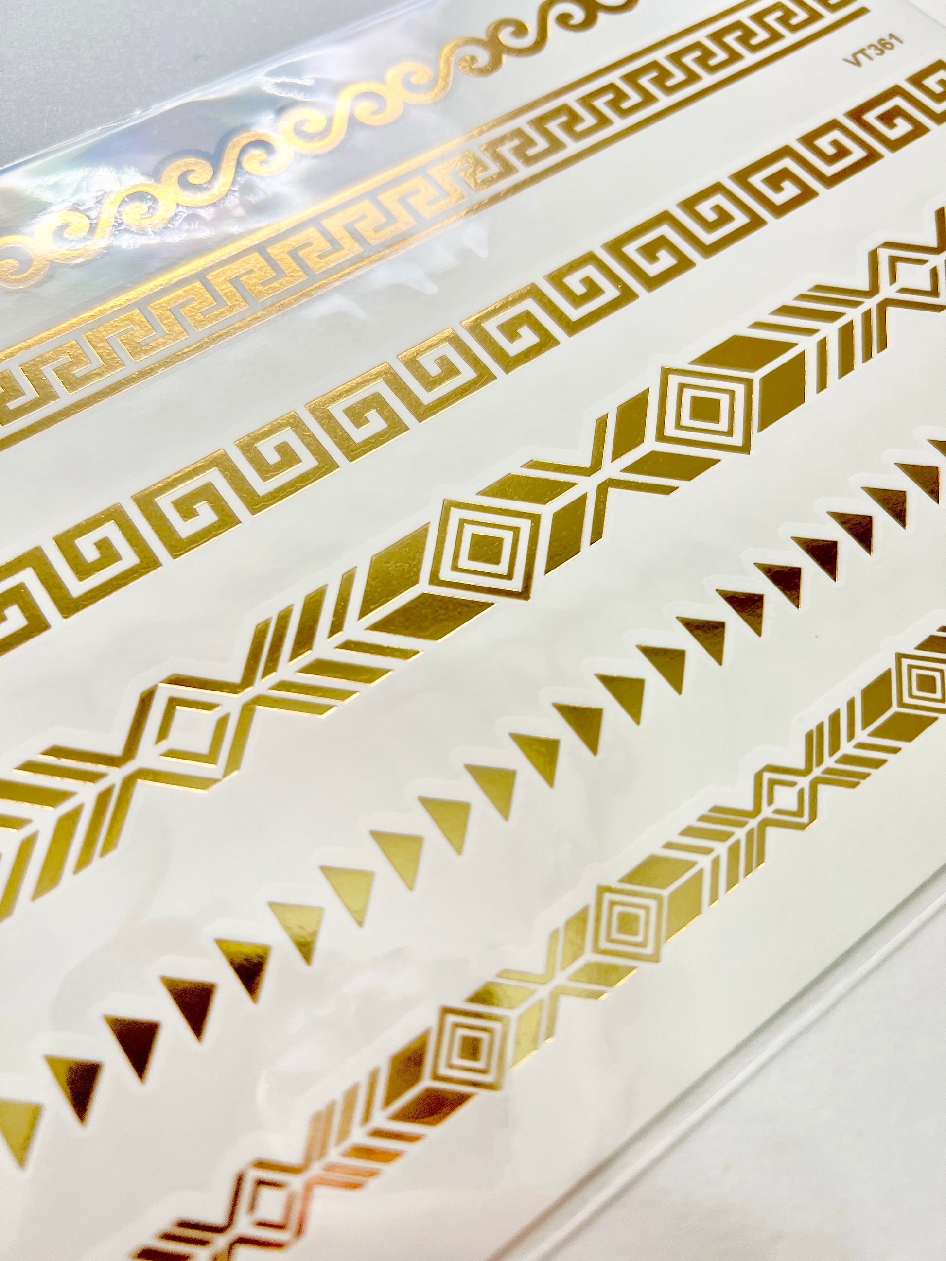Estos tatuajes temporales metálicos en tonos dorado y plateado están diseñados para realzar tu cuerpo con un toque de brillo.