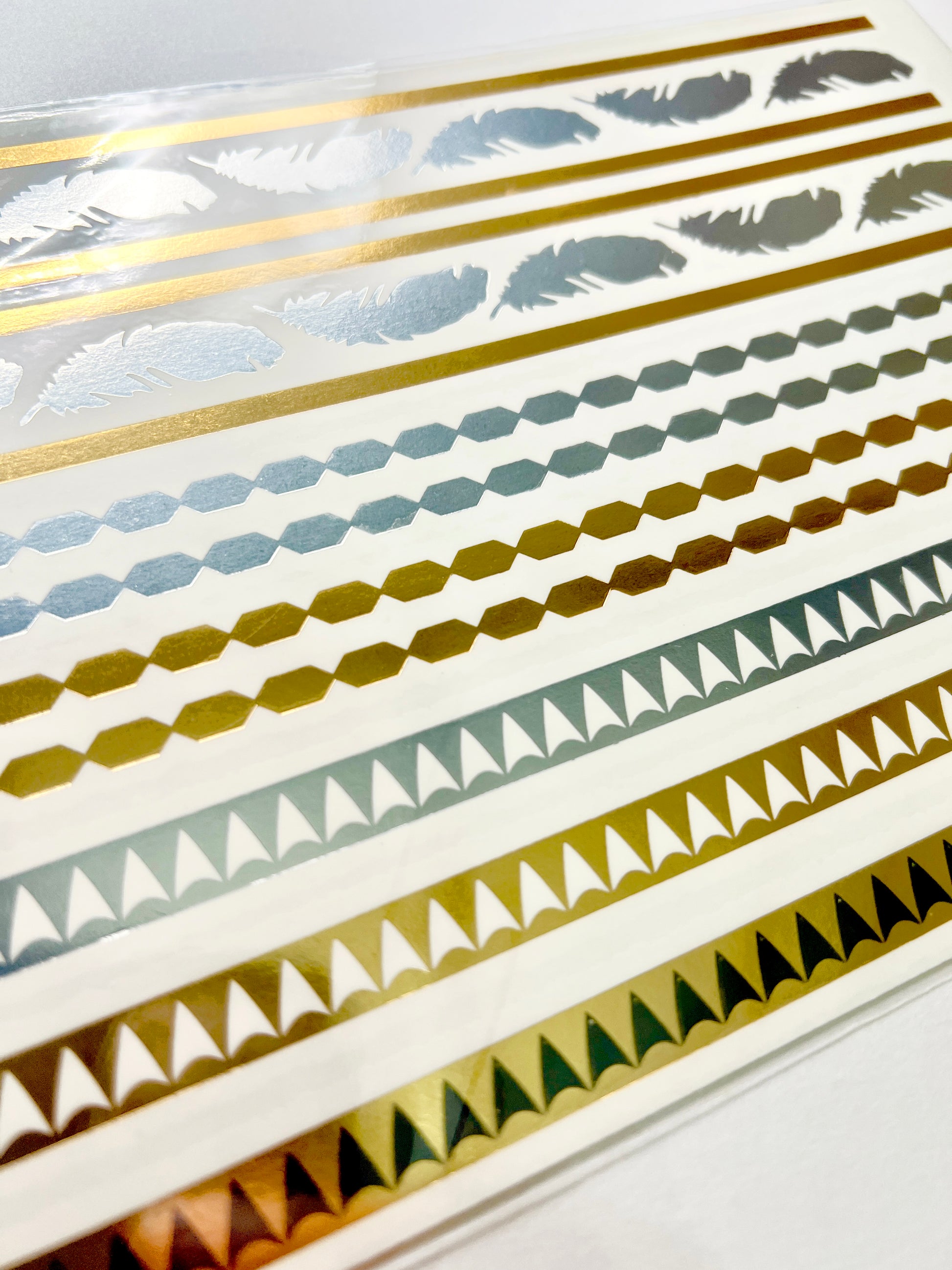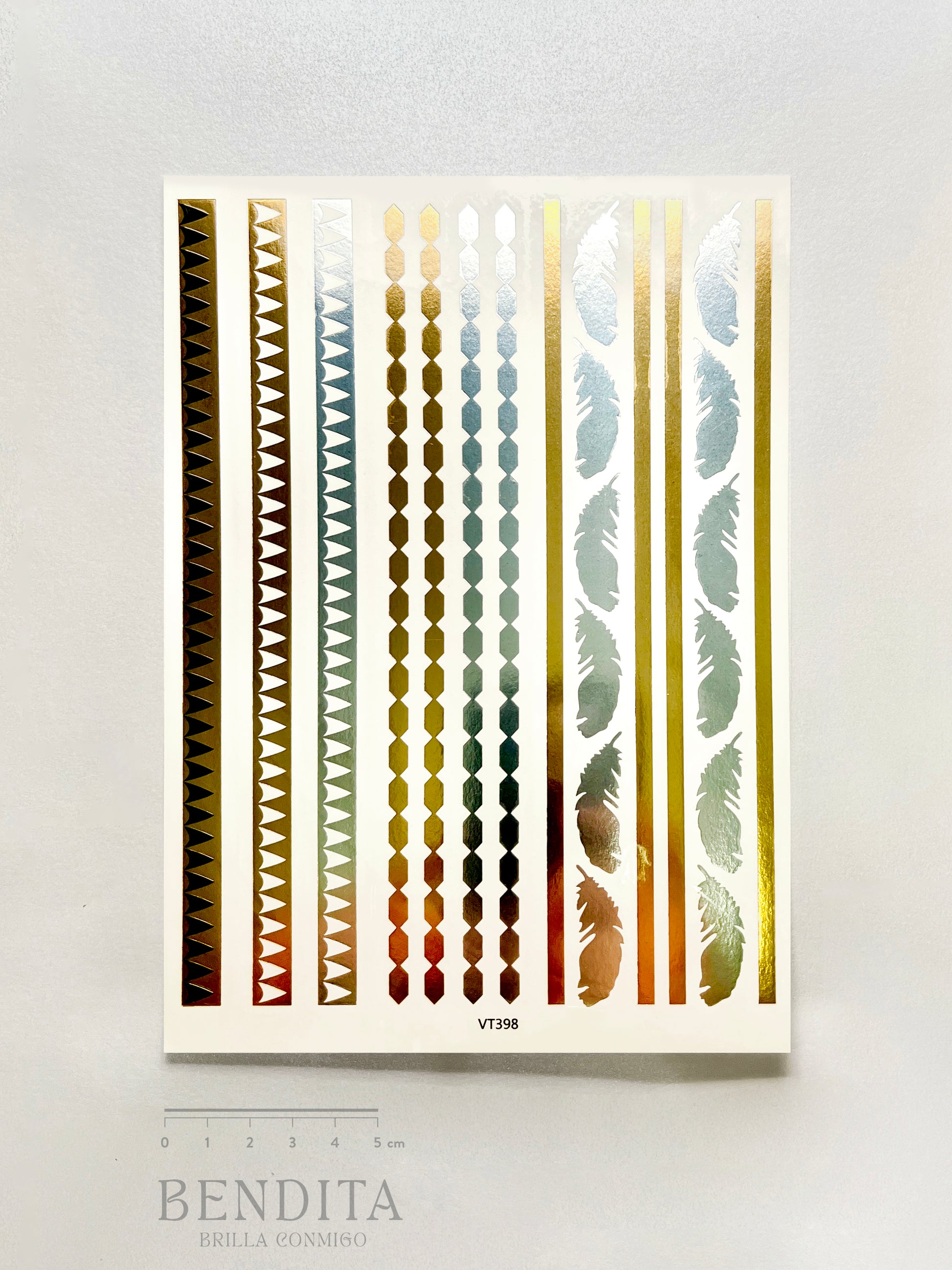Estos tatuajes temporales metálicos en tonos dorado y plateado están diseñados para realzar tu cuerpo con un toque de brillo.