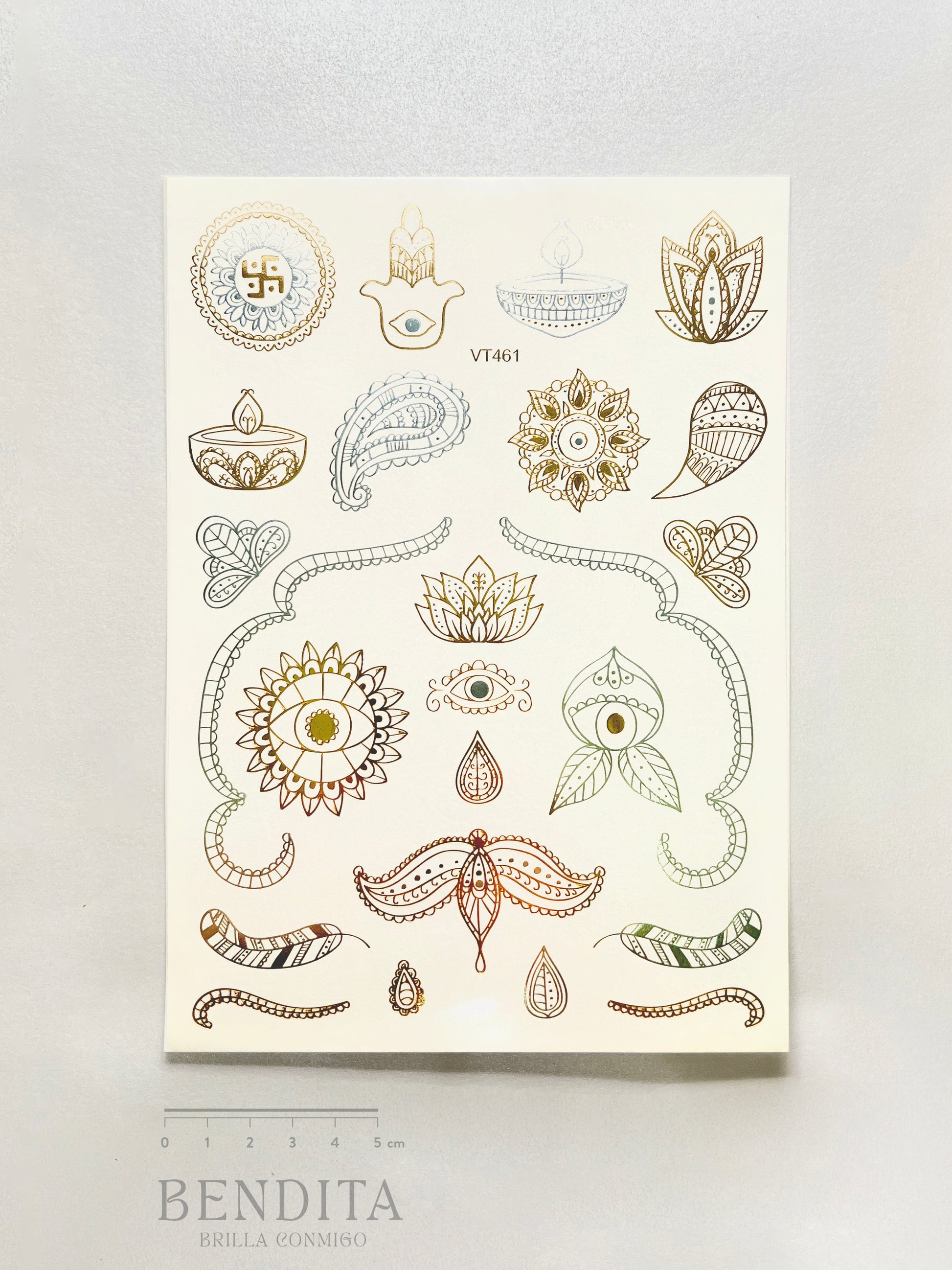 Estos tatuajes temporales metálicos en tonos dorado y plateado están diseñados para realzar tu cuerpo con un toque de brillo.