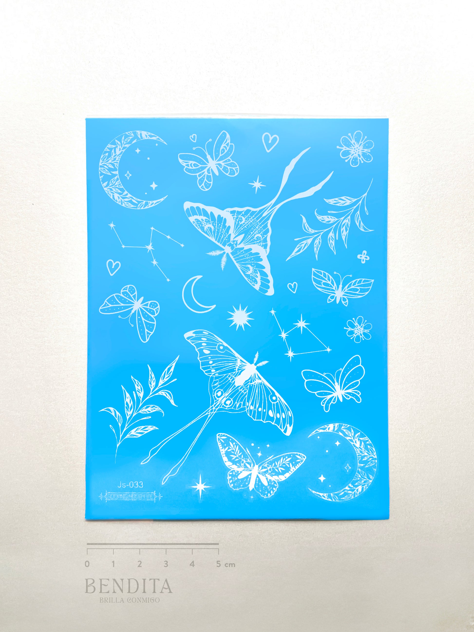 Lunas, Polillas, Estrellas y Ramas en Tinta Blanca