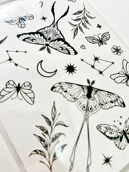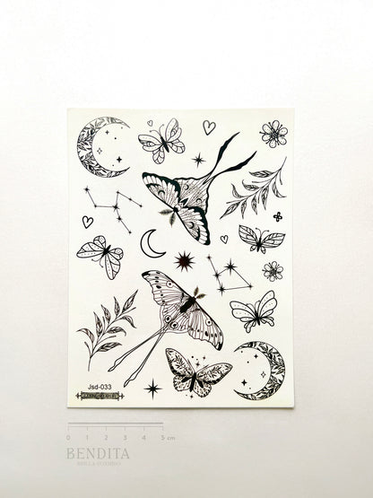 Lunas, Polillas, Estrellas y Ramas en Tinta Negra