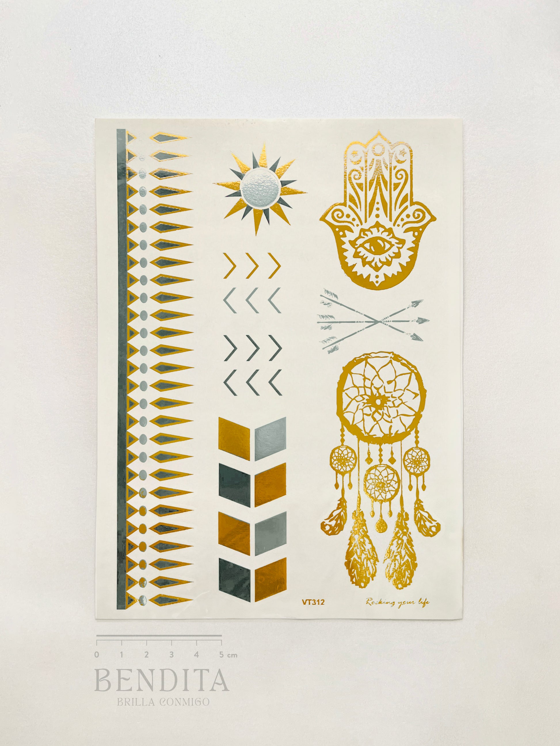 Estos tatuajes temporales metálicos en tonos dorado y plateado están diseñados para realzar tu cuerpo con un toque de brillo.