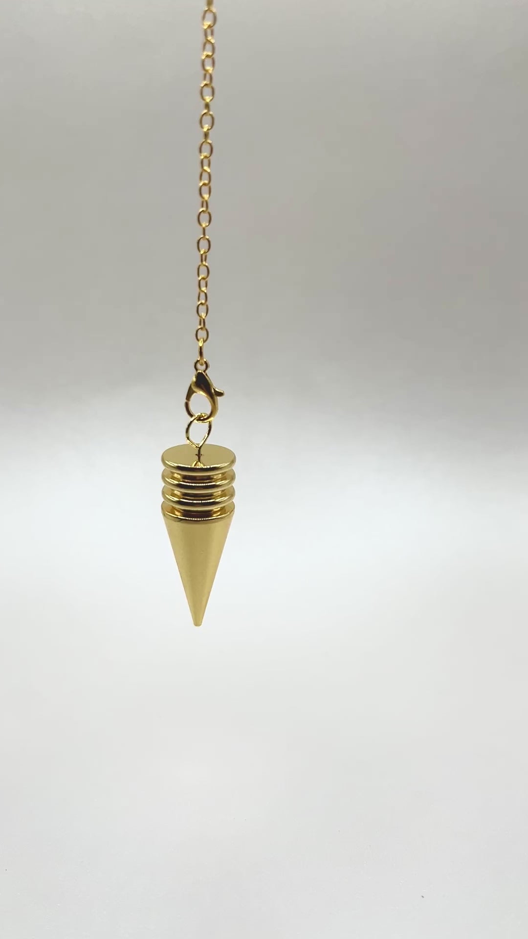 CaracterísticasForma y Material: Péndulo enchapado en oro, con un tamaño de aproximadamente 3.5 cm de alto x 1.5 cm de ancho.