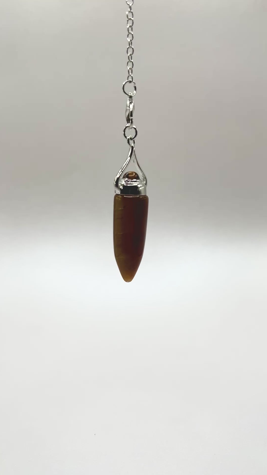 Forma y Material de la Piedra: Punta alargada de Ojo de Tigre, 5 cm de alto x 1.5 cm de ancho.