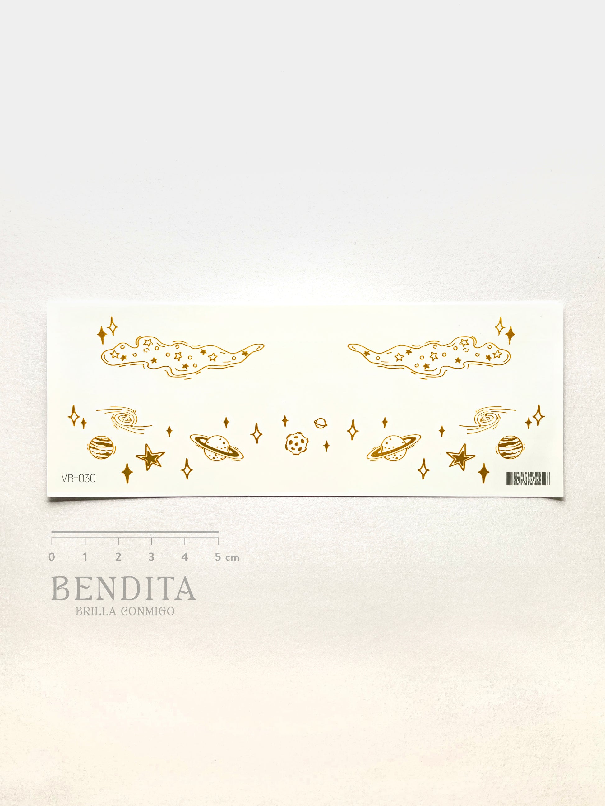 Estos tatuajes temporales metálicos en tonos dorado y plateado están diseñados para realzar tu rostro con un toque de brillo.