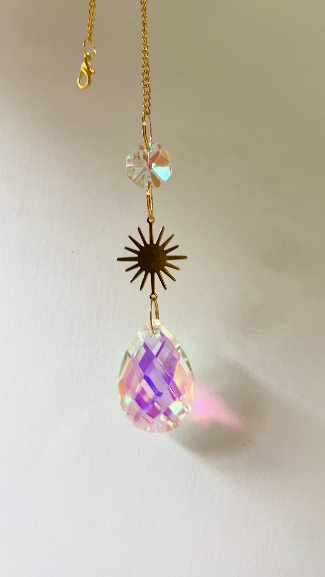 Ilumina tu hogar con este radiante atrapasol de cristal que cuenta con un dije de sol dorado. Las dos piezas de cristal pulido reflejan la luz de manera brillante, creando destellos cálidos y acogedores. Perfecto para ventanas, este atrapasol llenará tu hogar de luz y alegría.