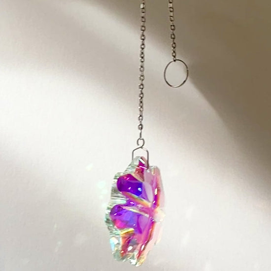 Este delicado diseño en cristal, suspendido de una cadena plateada, crea reflejos que llenan tu hogar de alegría y buena fortuna. Ideal para ventanas, este atrapasol no solo decora, sino que también simboliza prosperidad y positividad.