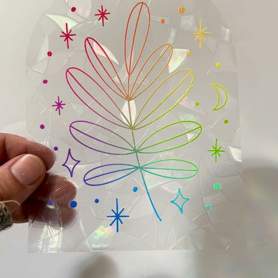 Añadí un toque mágico y colorido a tu espacio con este atrapasol en sticker que presenta una delicada hoja en tonos de arcoíris rodeada de estrellas. Este diseño proyecta reflejos encantadores y vibrantes de luz solar, llenando tus ventanas con destellos de color y un aire de fantasía. Perfecto para quienes buscan una decoración fresca y mágica.